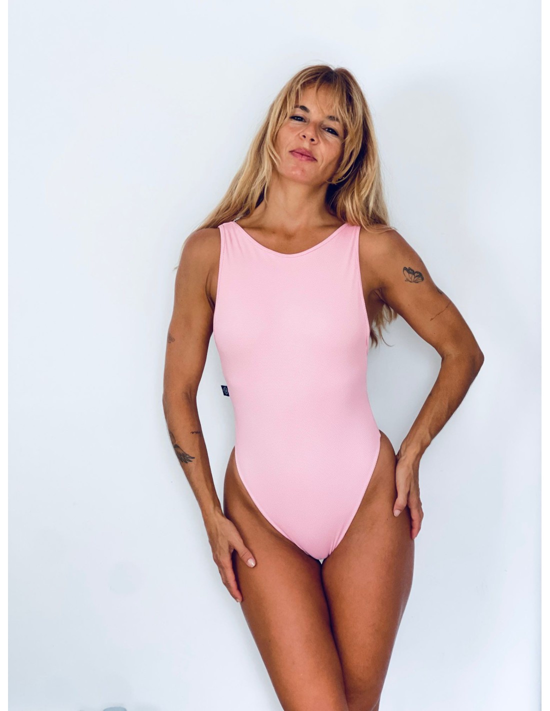 Bañador de una sola pieza con escote delantero cerrado y aperturas laterales. Modelo muy alto de cadera, tiras anchas imitando a tirantes y braguita tanga. Costuras invisibles para mayor comodidad.