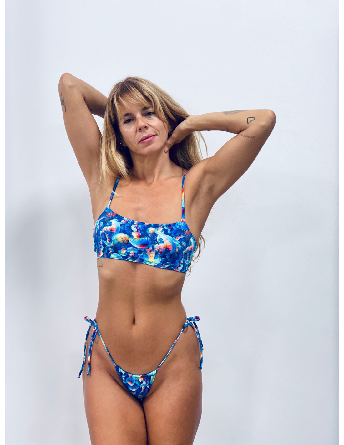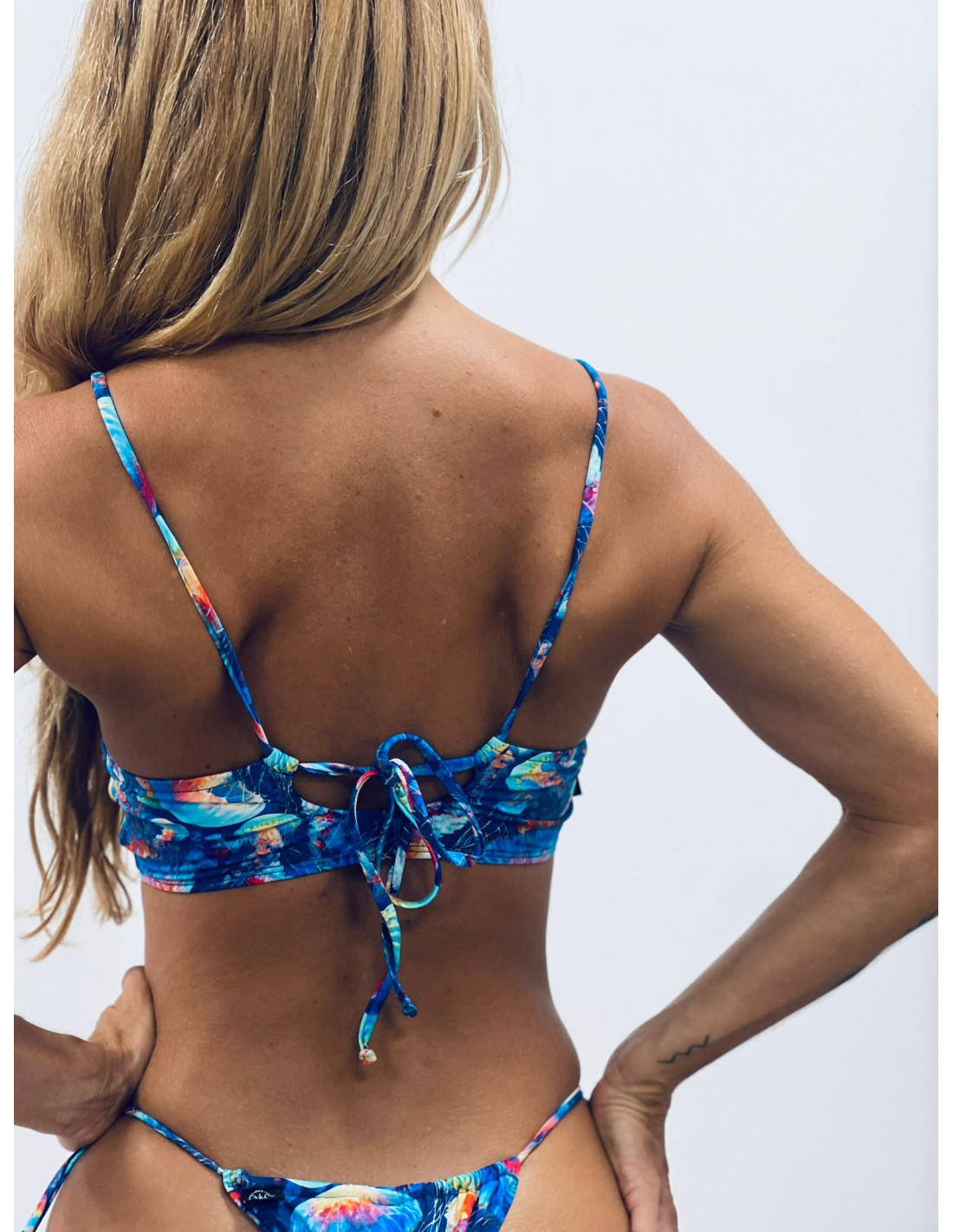 Nuestro top básico de bikini Best Seller. Top deportivo con escote redondo y tiras finas ajustables. Espalda cerrada y posibilidad de jugar con las tiras para usar de maneras diferentes. Versátil y cómodo.