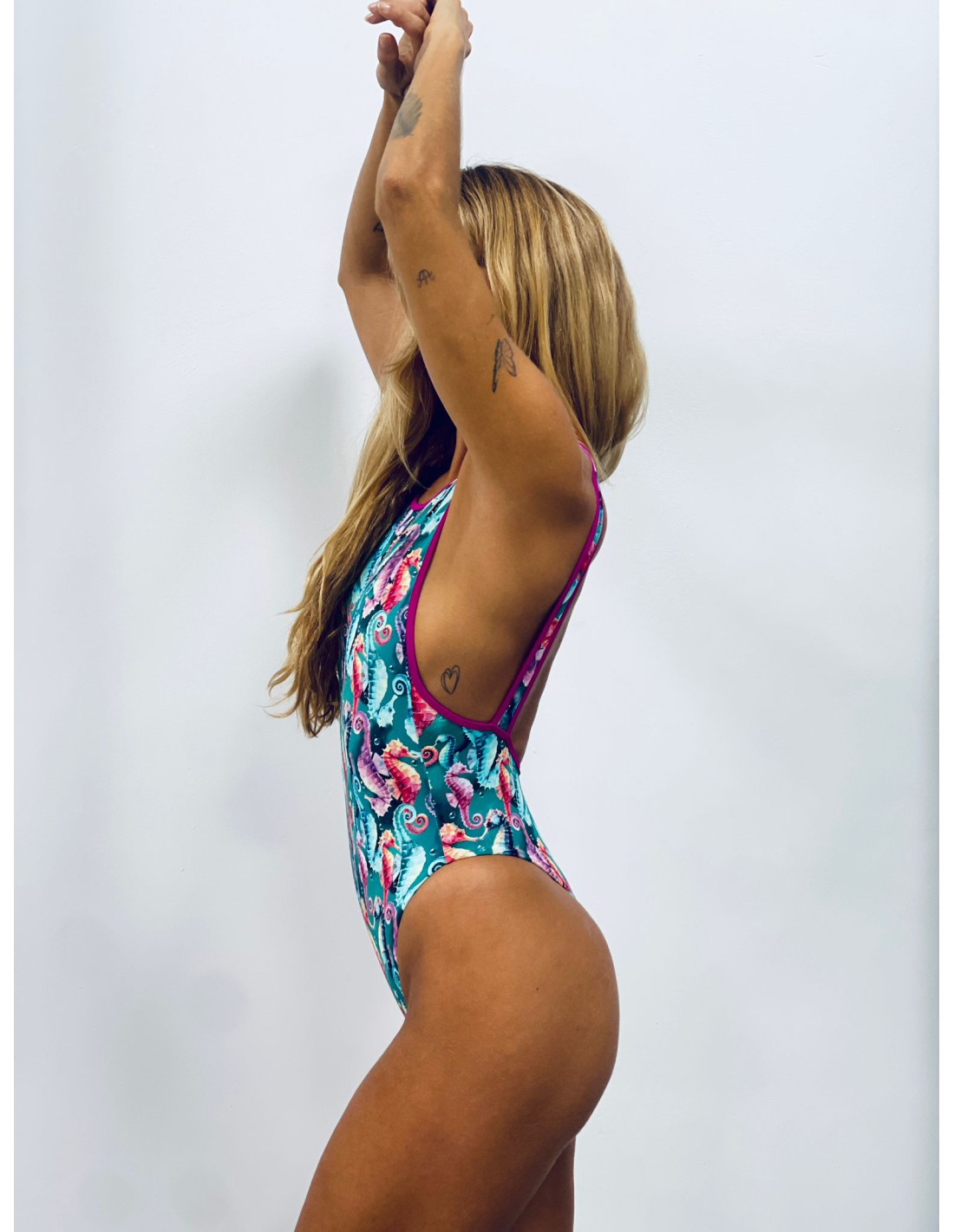 Bañador de una sola pieza con escote delantero cerrado y aperturas laterales. Modelo muy alto de cadera, tiras anchas imitando a tirantes y braguita tanga. Costuras invisibles para mayor comodidad.