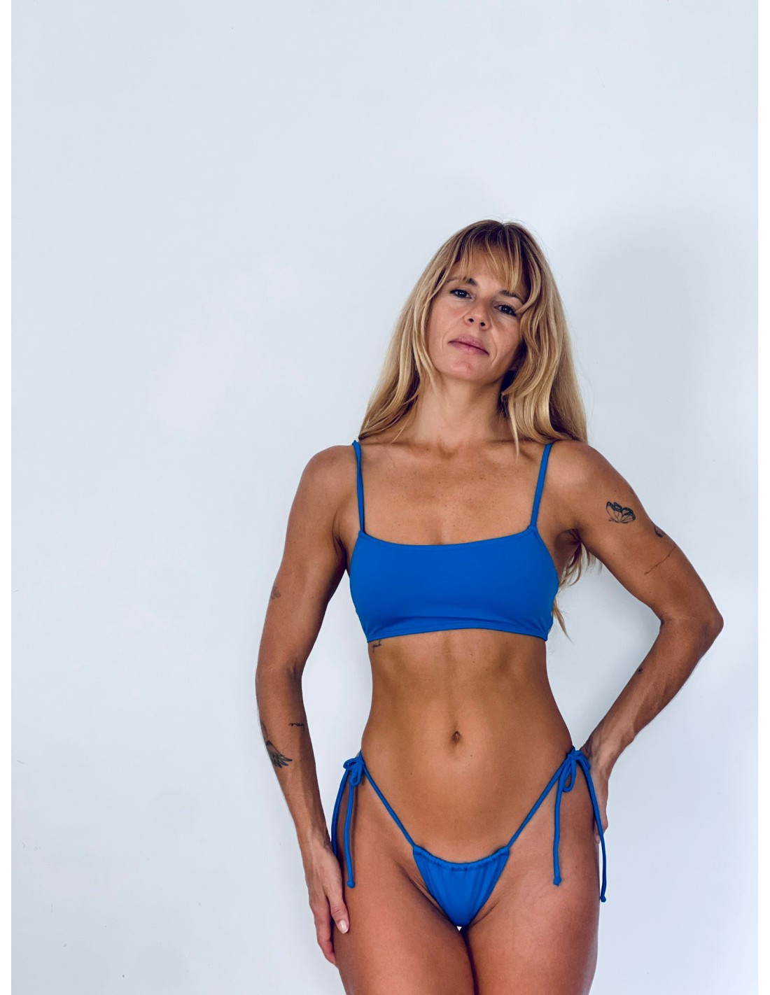 Nuestro top básico de bikini Best Seller. Top deportivo con escote redondo y tiras finas ajustables. Espalda cerrada y posibilidad de jugar con las tiras para usar de maneras diferentes. Versátil y cómodo.