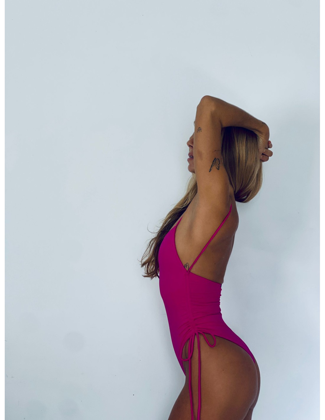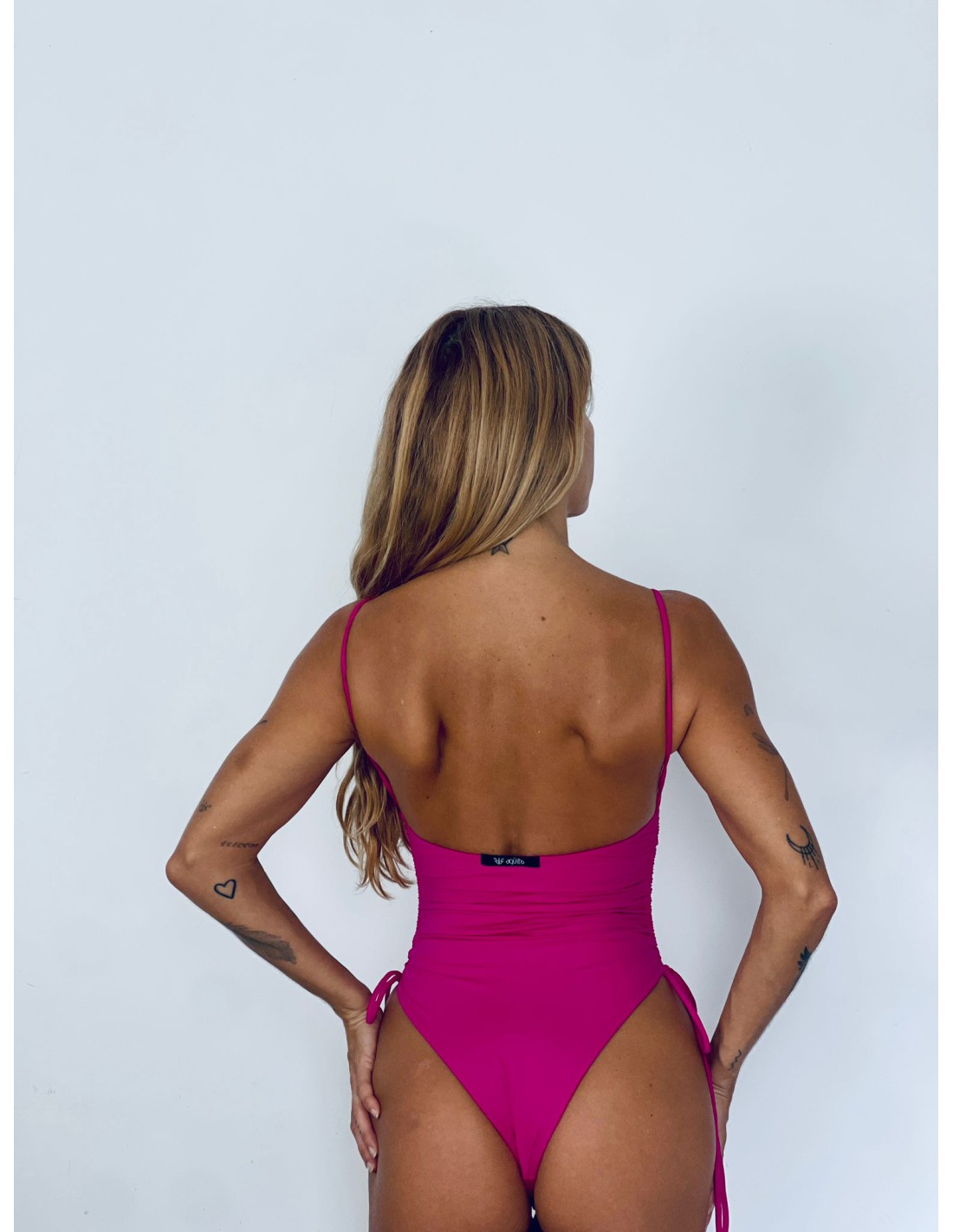 El bañador Martha nace de la unión del top marta y el short Martha. Tiene un diseño sencillo y elegante con tirantes finos que ofrecen un ajuste delicado sobre los hombros. La parte delantera presenta un escote redondeado discreto y clásico. Los costados del bañador tienen cordones ajustables, lo que permite personalizar la altura de la cadera y asegurar un ajuste perfecto. La parte trasera es abierta, mostrando la espalda y asegurando un bronceado uniforme. Además, el corte alto en las caderas y la cobertura mínima en la parte posterior resaltan la figura, combinando estilo y funcionalidad en un solo modelo.